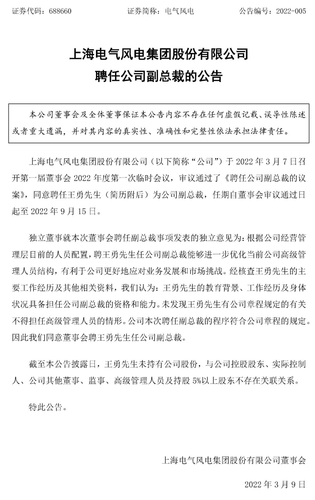 电气风电3月8日晚间发布公告称,公司审议通过了《聘任公司副总裁的议案》,同意聘任王勇先生为公司副总裁。